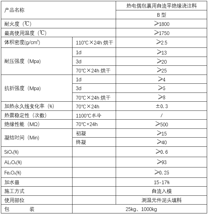 為了適應(yīng)現(xiàn)代化鋼廠對鋼水測溫定氧的準確性,我公司特研制了熱電偶包裹用高絕緣自流平中性水性填料。產(chǎn)品完全脫離了上世紀80年代研制的酸性鎂質(zhì)填料,該產(chǎn)品使用自來水攪拌后就可直接澆注偶頭,靜放12小時后就可以進入烤箱烘烤,比傳統(tǒng)酸性鎂質(zhì)填料縮短一倍烘烤時間就能達到理想的絕緣指數(shù),本產(chǎn)品以其優(yōu)良的自流動性、防潮性、操作簡單性、測溫準確性、高絕緣性、機械強度高、高溫下不變形、不爆裂等點贏得了廣大用戶的一致好評。