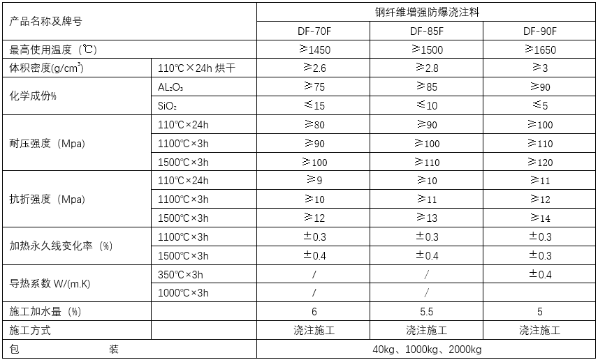 在高強(qiáng)防爆耐火澆注料的基礎(chǔ)上,加入了新型熔抽型鋼纖維及特殊添加劑,嚴(yán)格控制顯微結(jié)構(gòu),使?jié)沧⒘显诒3衷袃?yōu)點(diǎn)上,增加了澆注料的強(qiáng)度和韌性提高抗剝落性,熱震穩(wěn)定性和抗裂性、高耐磨性防爆。